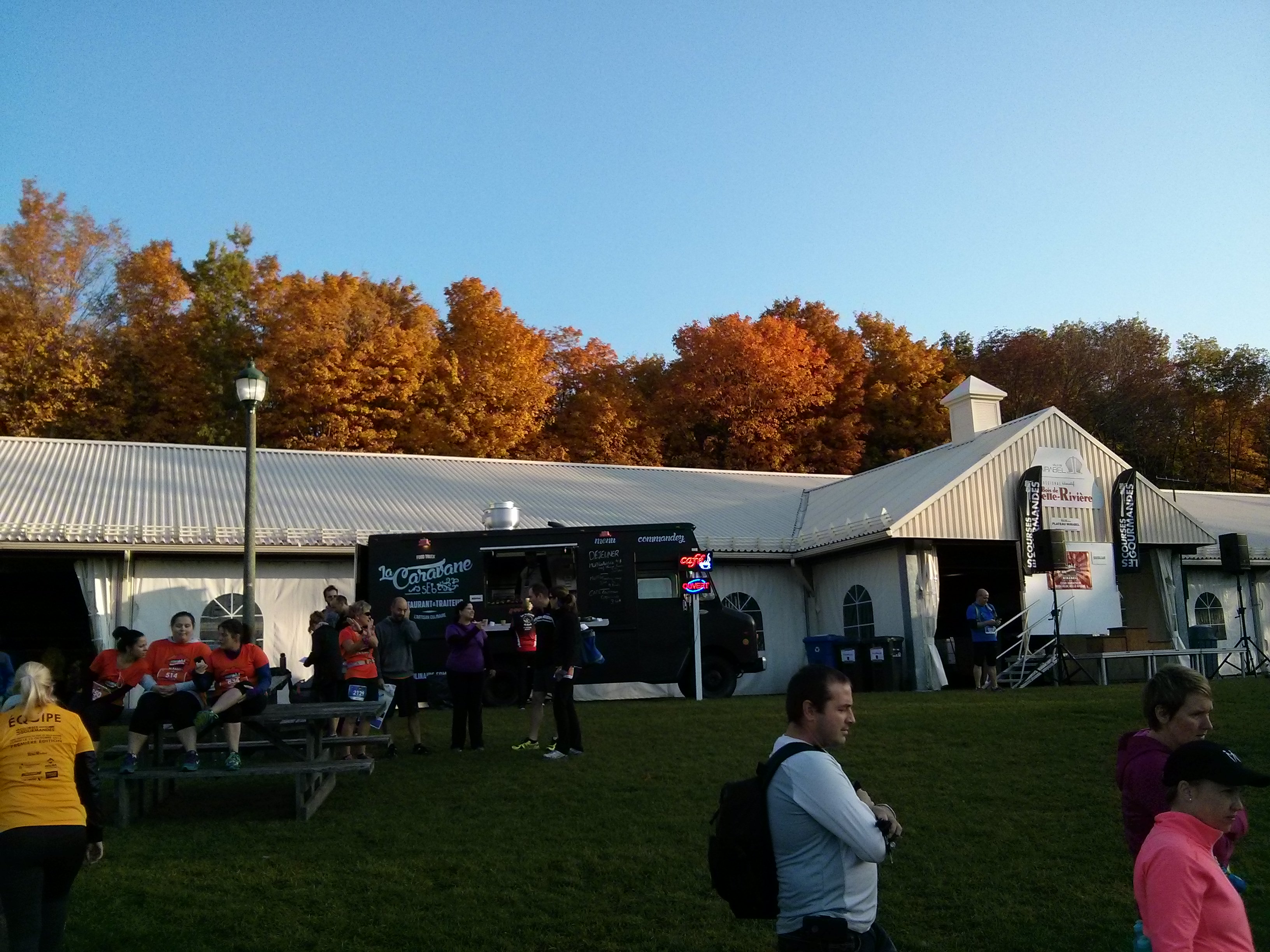 Le temps de l'année est tout simplement parfait pour une course dans un parc régional, et pour couronner le tout nous avons une belle journée ensoleillée pour faire ressortir toutes les belles couleurs éclatantes des arbres tout autour... un vrai bonheur! Les Courses Gourmandes nous offrent toujours une organisation impeccable et une ambiance chaleureuse, le site de départ est donc rempli de participants et il y règne une belle ambiance. Bon pas complètement impeccable cette fois-ci car les départs ont dû être légèrement retardés... mais c'était tout de même très bien!