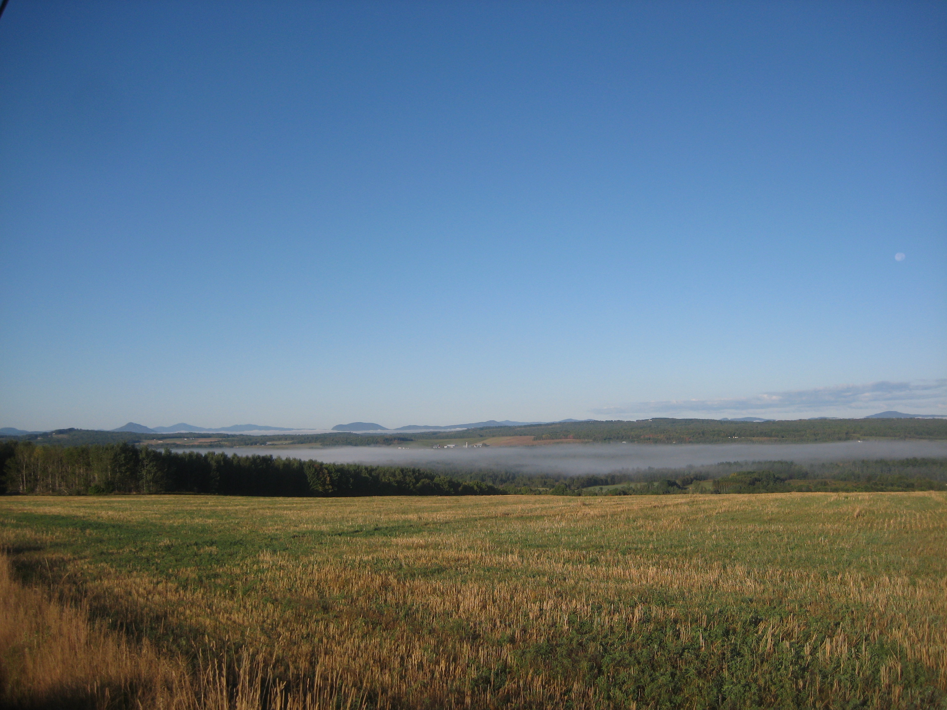 L'estrie offre vraiment de beaux paysages, notamment avec ses différents monts. La température s'annonce superbe, le gros soleil pour toute la journée et un matin plus frais que par chez moi (8°C vs 13°C à Deux-Montagnes), mais ça se réchauffera rapidement et c'est parfait pour courir. Nous arrivons au village en suivant des routes brumeuses et côteuses, promettantes de ne pas rendre la vie trop facile aux coureurs.