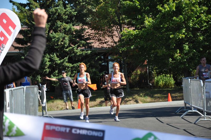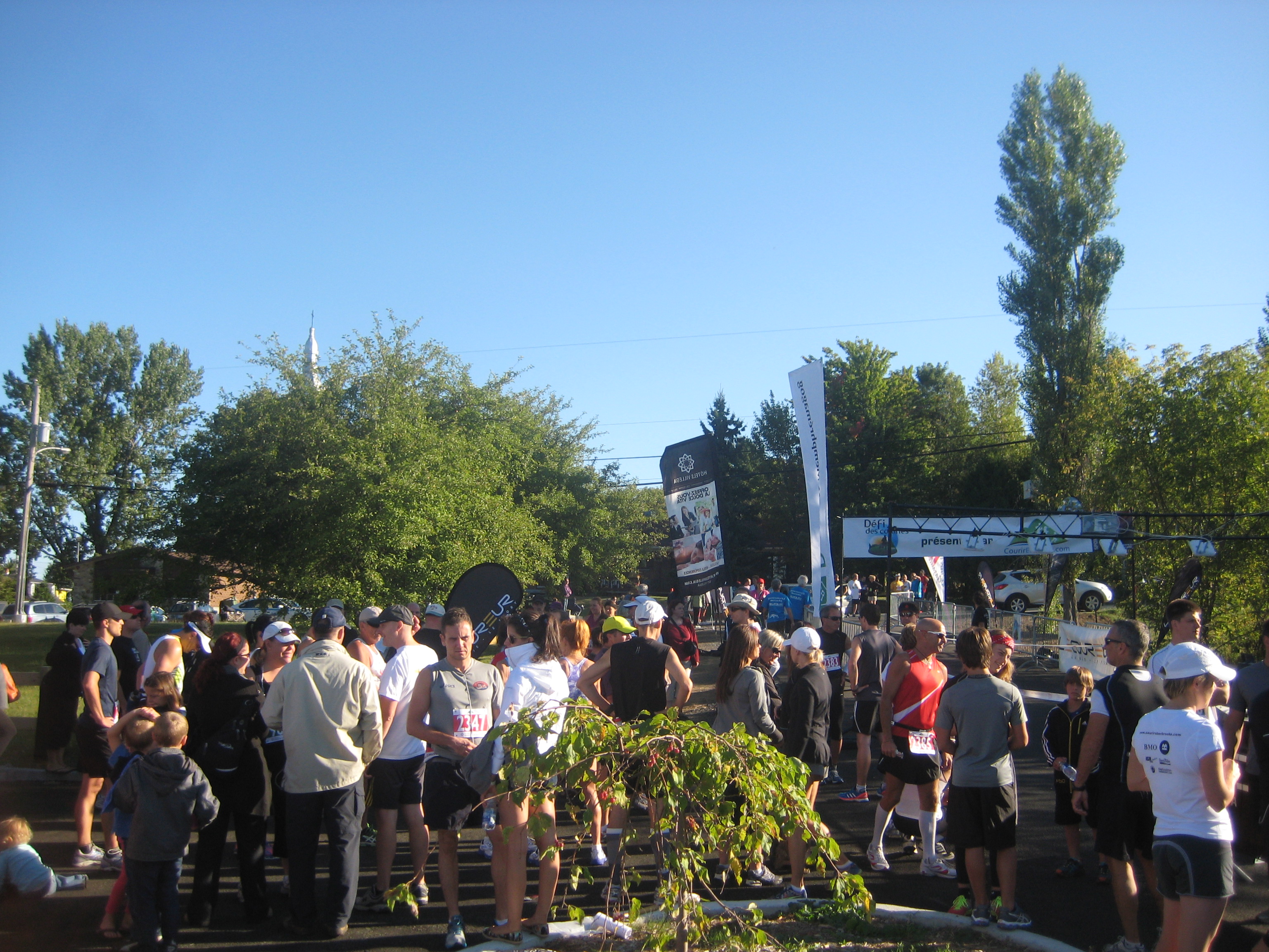 Vu le modeste taux de participation à cet événement je ne m'attendais pas à y connaître personne, mais je rencontre tout de même (encore une fois) les jumelles Puntous, omni-présentes sur nos parcours de course au Québec. C'est toujours un plaisir d'aller jaser un peu avec elles, comme moi elles feront le 30 km. Elles m'apprennent d'ailleurs qu'il y a un nouveau marathon dans la province, en fait le premier dans les Laurentides, à Rivière-Rouge à la fin octobre... je ne croirais pas le faire cette année, mais j'en prends définitivement note!