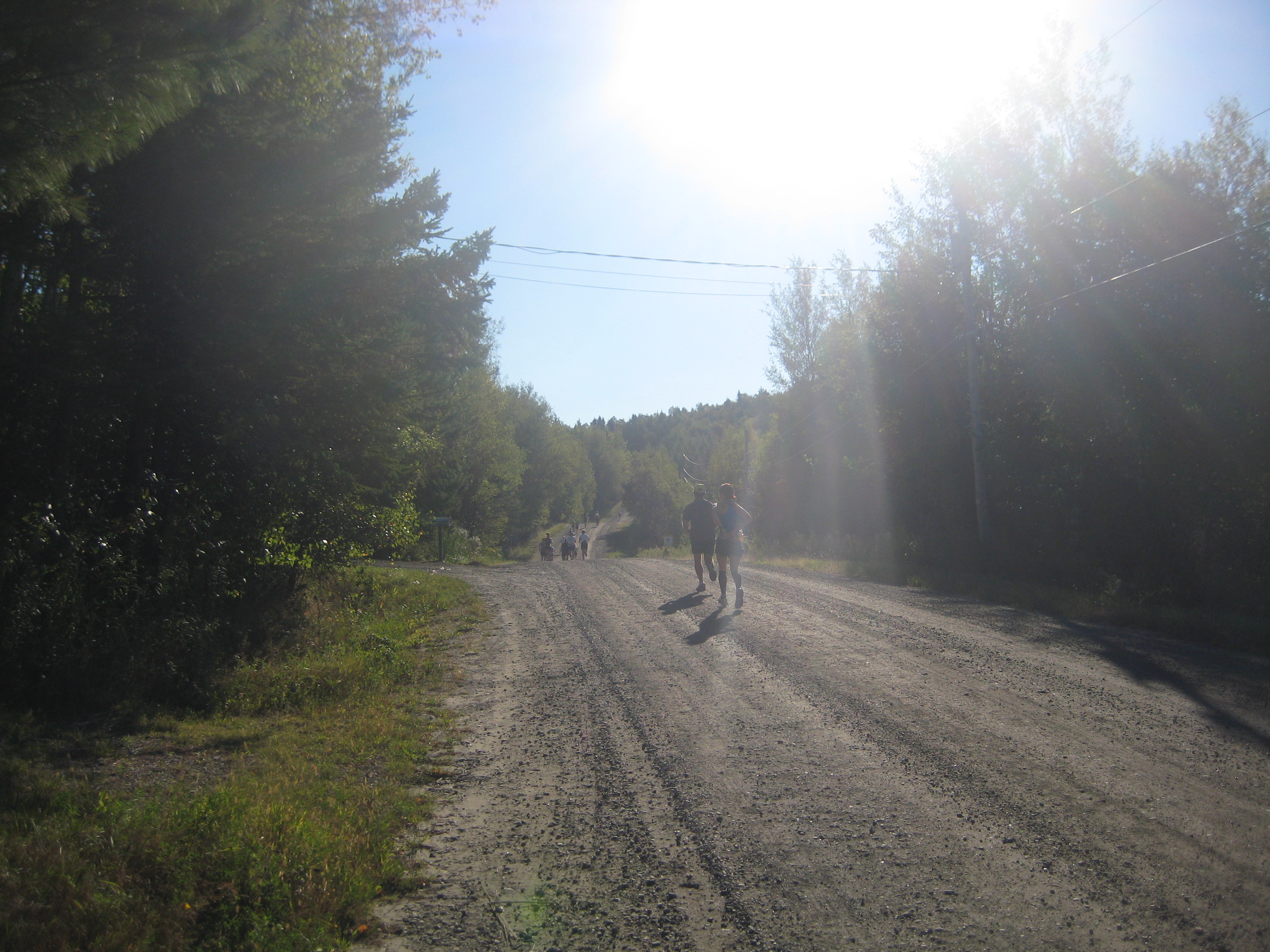 Nous sommes près de 700 participants au total en incluant les distances de 1, 5.5, 11, 15 et 30 km. Nous sommes 65 personnes participant au 30 km, un nombre assez modeste. Le parcours est en fait un aller-retour commençant par une boucle de 5.5 km autour du village, se poursuivant sur une route allant vers le sud jusqu'aux abords du Lac Massawippi et puis le même trajet au retour. Puisque les participants du 15 km feront le même trajet mais seulement la partie du retour (une navette les amène au départ), nous aurons tout de même un peu de compagnie sur le parcours.
