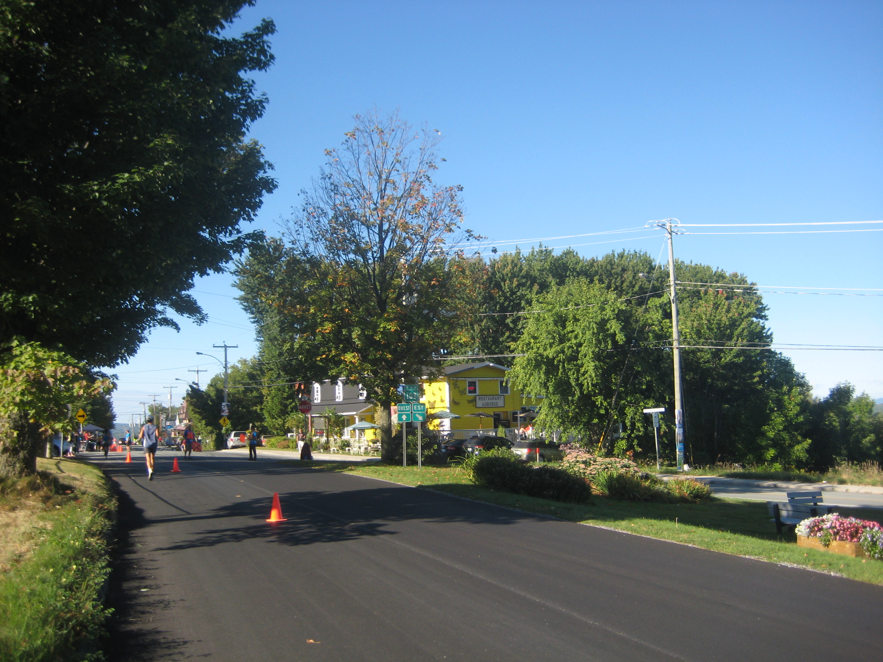 Après la boucle et un petit tour au village nous voilà à faire un long aller-retour sur une même route, qui descend, et descend, et descend, et descend... une petite voix dans ma tête me rappelle qu'il faudra forcément remonter toutes ces côtes, et que même si la montée est normalement ma force, wow ça ne sera pas facile! Pas pour rien que ça s'appelle le Défi des Collines, je ne me rappelle pas d'aucun moment où nous étions sur du terrain plat pour plus d'une minute!